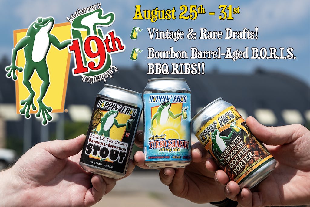It’s hard to believe, but Hoppin’ Frog is turning 19—and we want you to be part of the celebration! We’re making it a full week of fun, packed with some of our rarest and most special beers, like 2017 Gavel Slammer Monumental Dark Ale and 2017 Cherry Bitters Barrel-Aged T.O.R.I.S. The Tyrant Triple Oatmeal Imperial Stout.