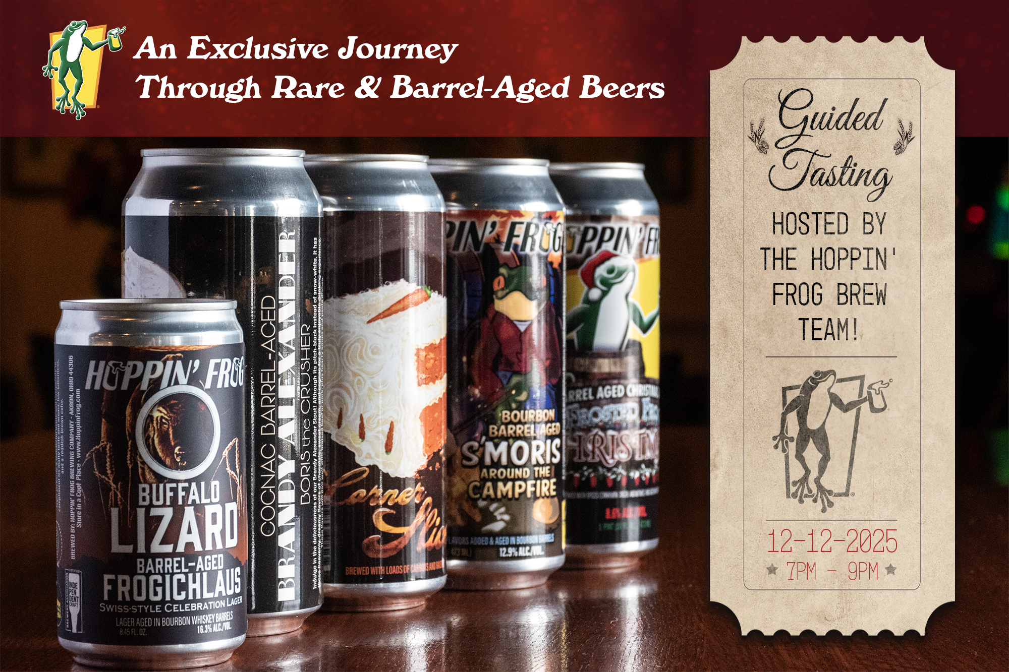 Be guided through a tour of special cellar-aged beers from our secret stash. Learn how some of the beers came to be, as your host shares the stories behind each of the beers. This will truly be a unique experience to see behind the curtain at Hoppin’ Frog!