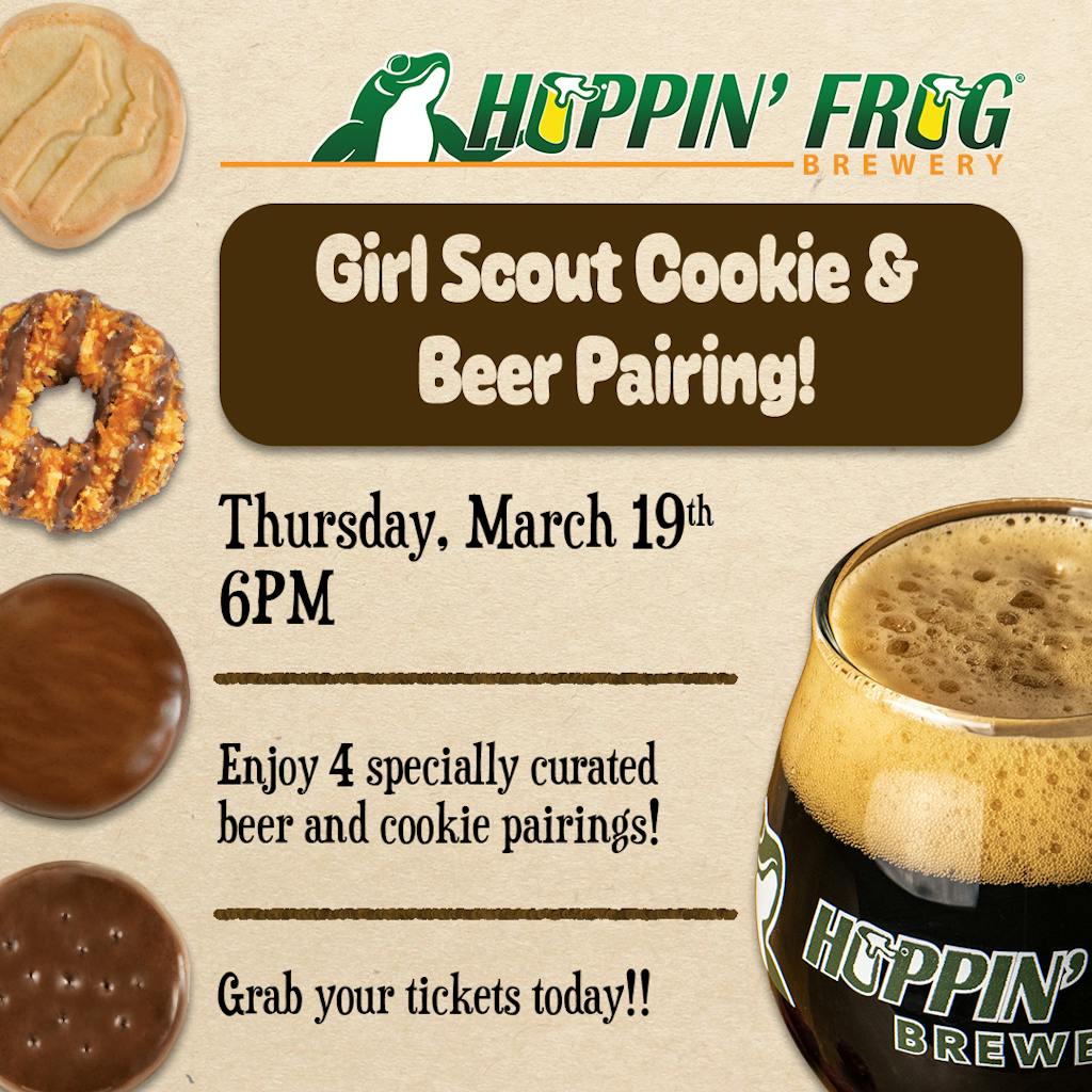 Treat yourself to a fun and flavorful tasting experience as our Brew Team guides you through a curated flight of four Hoppin’ Frog craft beers, each expertly paired with a classic Girl Scout Cookie. Explore how sweetness, richness, and bold beer character interact in unexpectedly delicious ways.