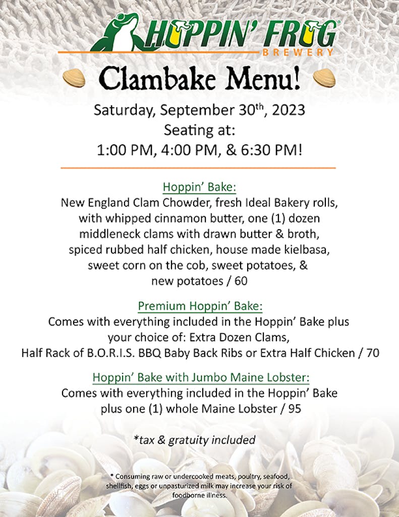 Join us on Saturday, September 30th, 2023 for our annual legendary Hoppin’ Frog Clambake! This is a ticketed event with limited seating available at 1 PM, 4 PM, & 6:30 PM! So, don’t wait! Follow the link: Click Here to purchase your Hoppin’ Bake! Price of Bakes include tax & gratuity. We hope your can join us and treat yourself to the good stuff!
