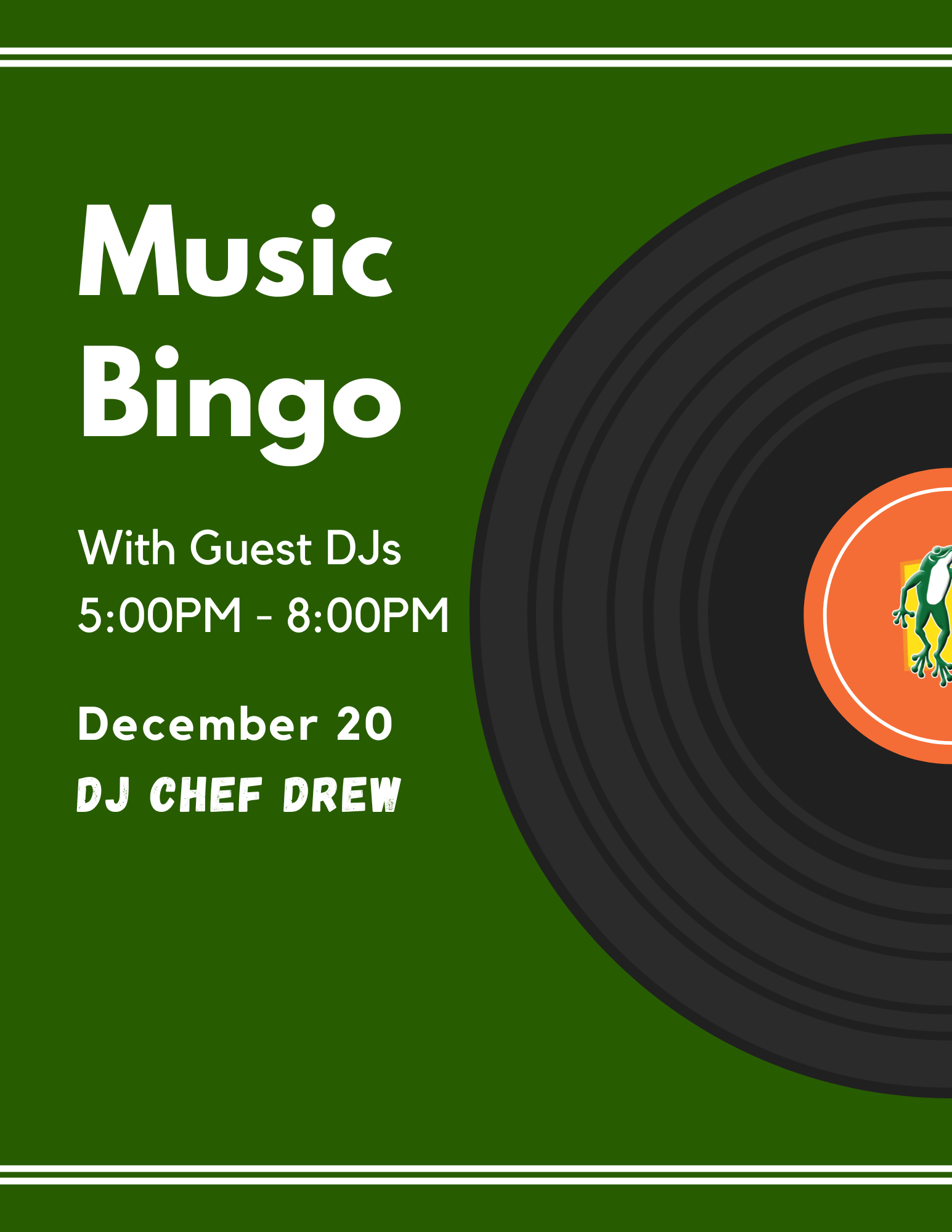 DJ Chef Drew will be spinning vinyl and playing music bingo from 5pm to 8pm! Win Gift Cards, enjoy an incredible selection of beers, and rock the evening away!