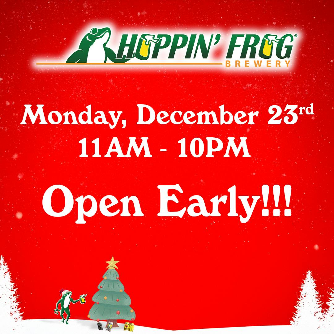 We know the holidays are a busy time of year! There’s lots of traveling, visiting with family and friends, along with shopping for the those perfect gifts! Here at Hoppin’ Frog we’ve decided to open early on Monday, December 23rd to give you more time to treat yourself to the good stuff! Stop by and grab a cold pint and some great food! Cheers!