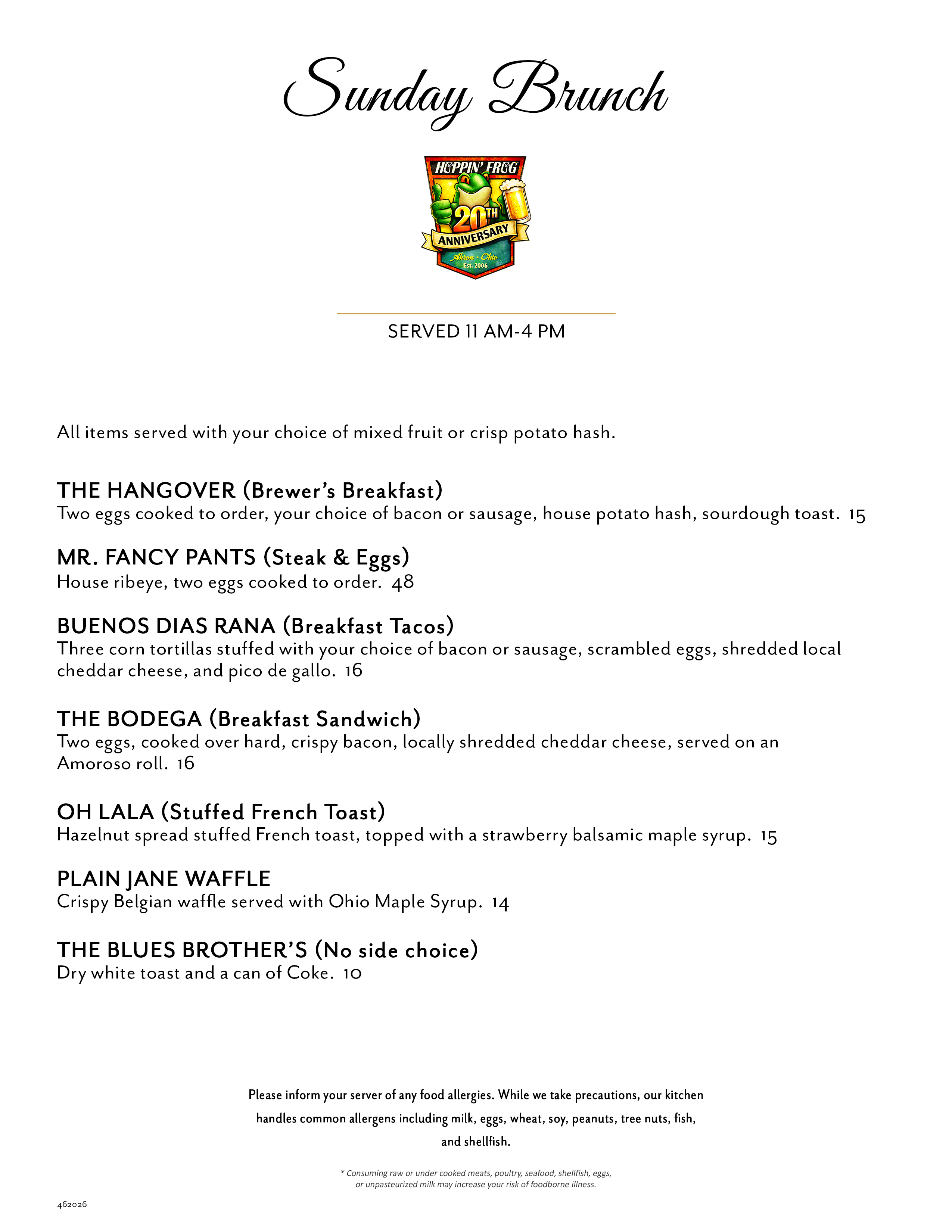 Join us every Sunday for our newly introduced Sunday Brunch menu, featuring a lineup of craveable classics and elevated plates designed to pair perfectly with your favorite Hoppin’ Frog beers.