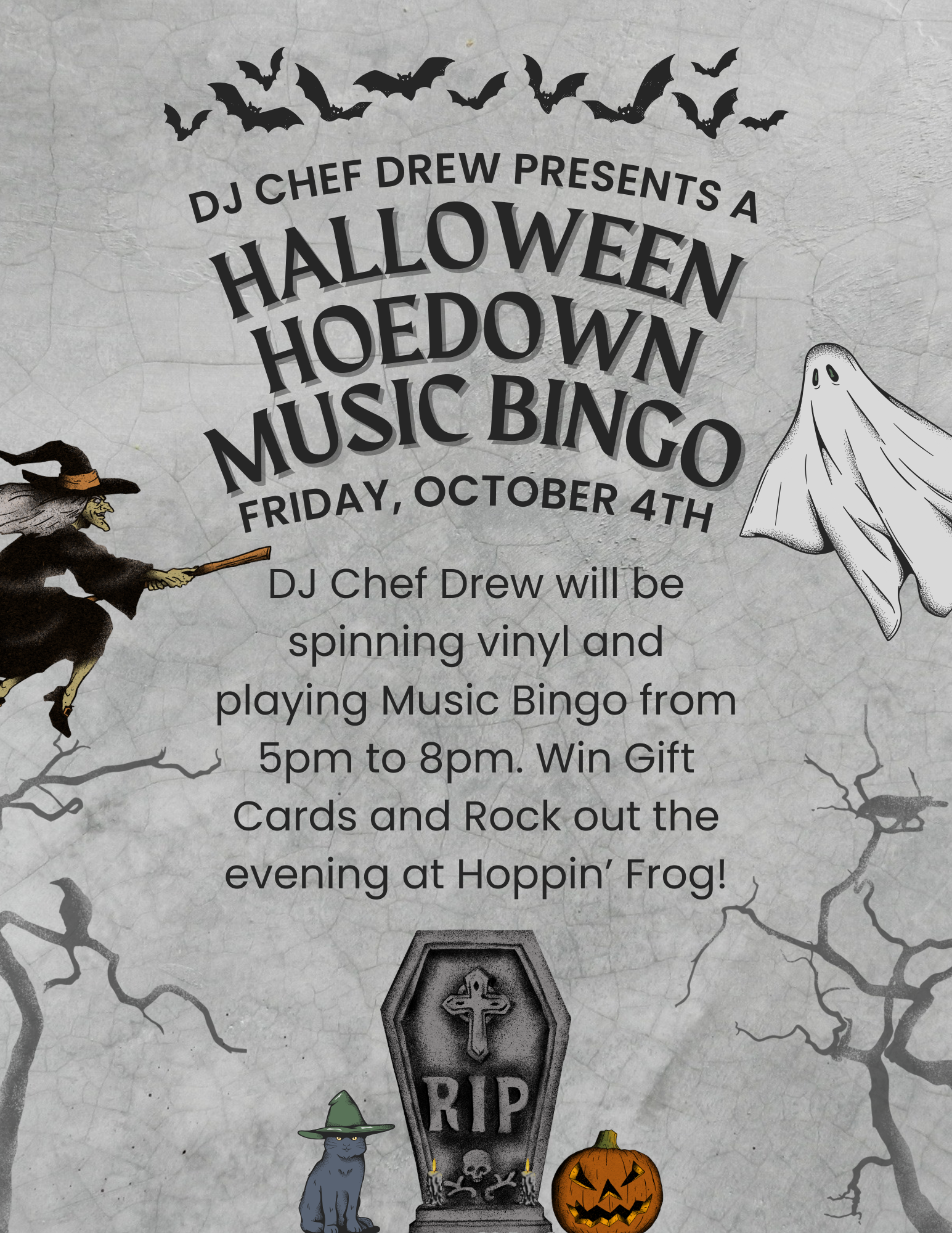 Join DJ Chef Drew for his Halloween Hoedown Friday, October 4th! DJ Chef Drew will be spinning vinyl and playing music bingo from 5pm to 8pm! Win Gift Cards, enjoy an incredible selection of beers, and rock the evening away!
