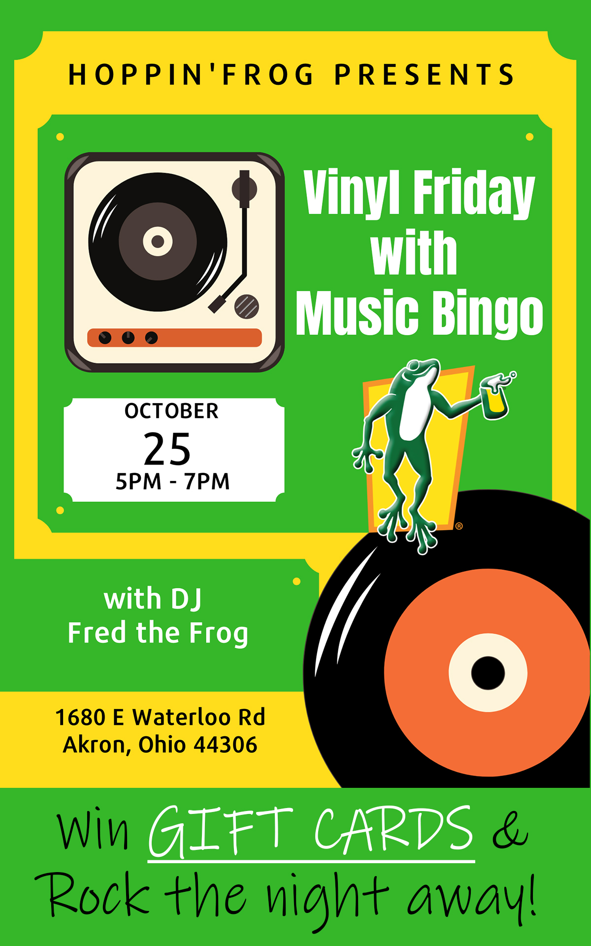 Come chill with DJ Fred The Frog, he will be spinning vinyl and playing music bingo from 5pm to 7pm! Win Gift Cards, enjoy an incredible selection of beers, and rock the evening away!